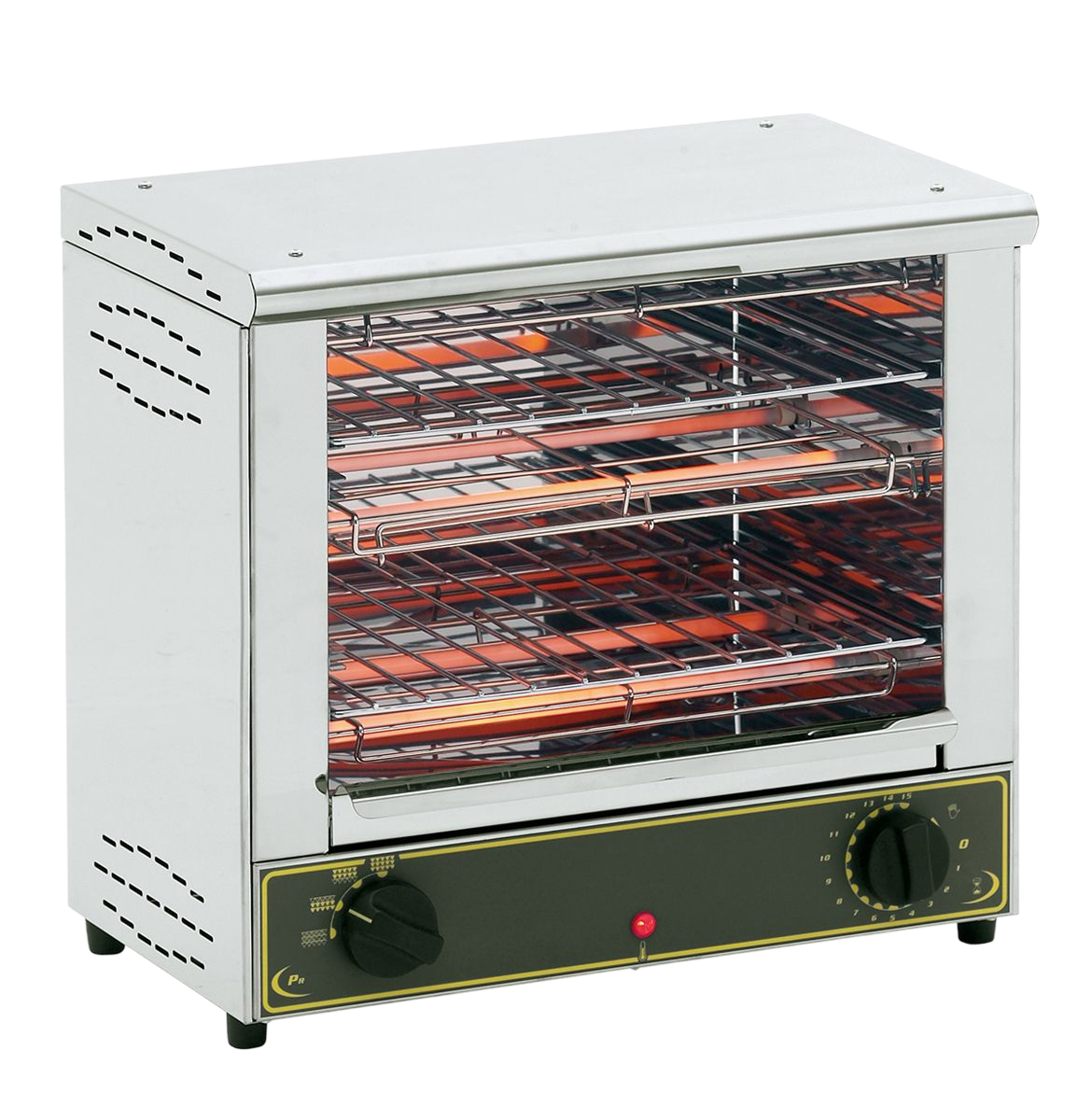 Features: selector for infrared quartz ramps, 15-minute-timer with lock position for non-stop use, control lights, patented protection grid for quartz tubes, crumb tray.