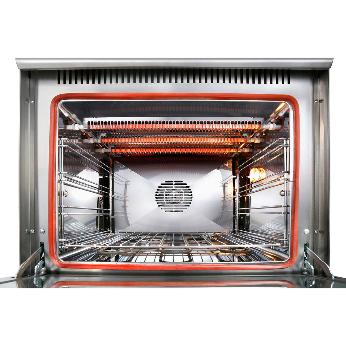 – The function “infrared ventilated grill” is essential for browning, grilling, icing dishes and also for roasting a chicken. The quartz tubes give out an invisible and harmless infrared radiation (1050 ° C) that is similar to the one emitted by embers. The infrared radiation comes into the flesh and turns into heat at core. This very even cooking respects the molecular structure and fibers of foods. Combined with the ventilation of the oven, the infrared is the ideal technology for roasting poultry with the rotisserie, grilling or cooking meats, fish, vegetables, cakes, brown pastries, browning pizzas, lasagna and other gratins.