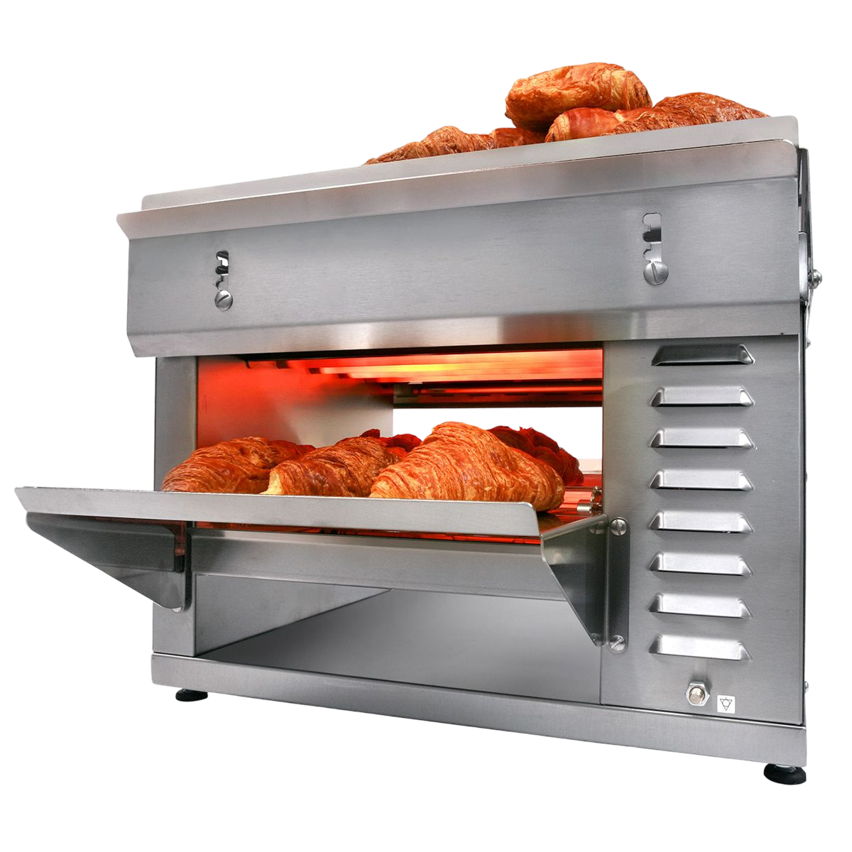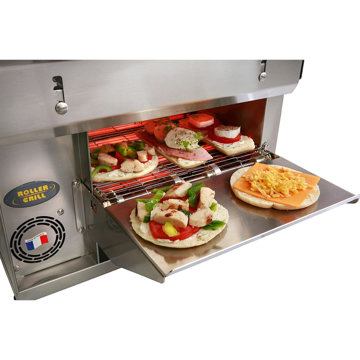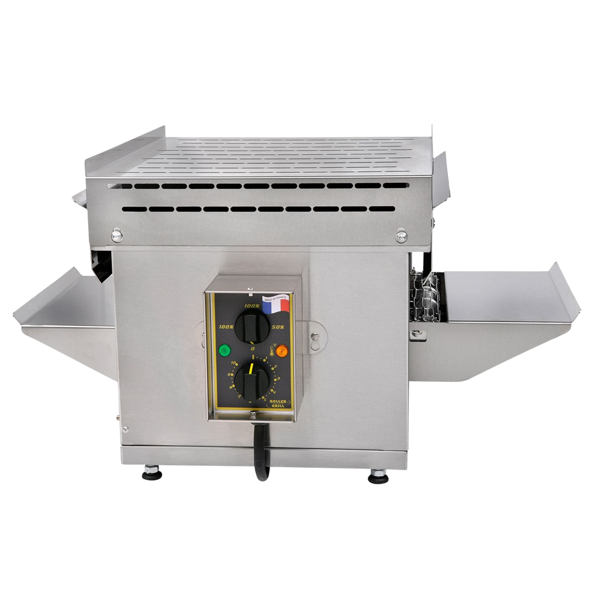 Features: 2 ramps of 4 quartz tubes (1550 W at the top, 1450 W at the bottom), heating selector (stop, full and half high power), variable speed drive, conveyor belt in flexible stainless steel mesh, front and rear trays of 15 cm, indicator lights, ventilated motor, adjustable feet.