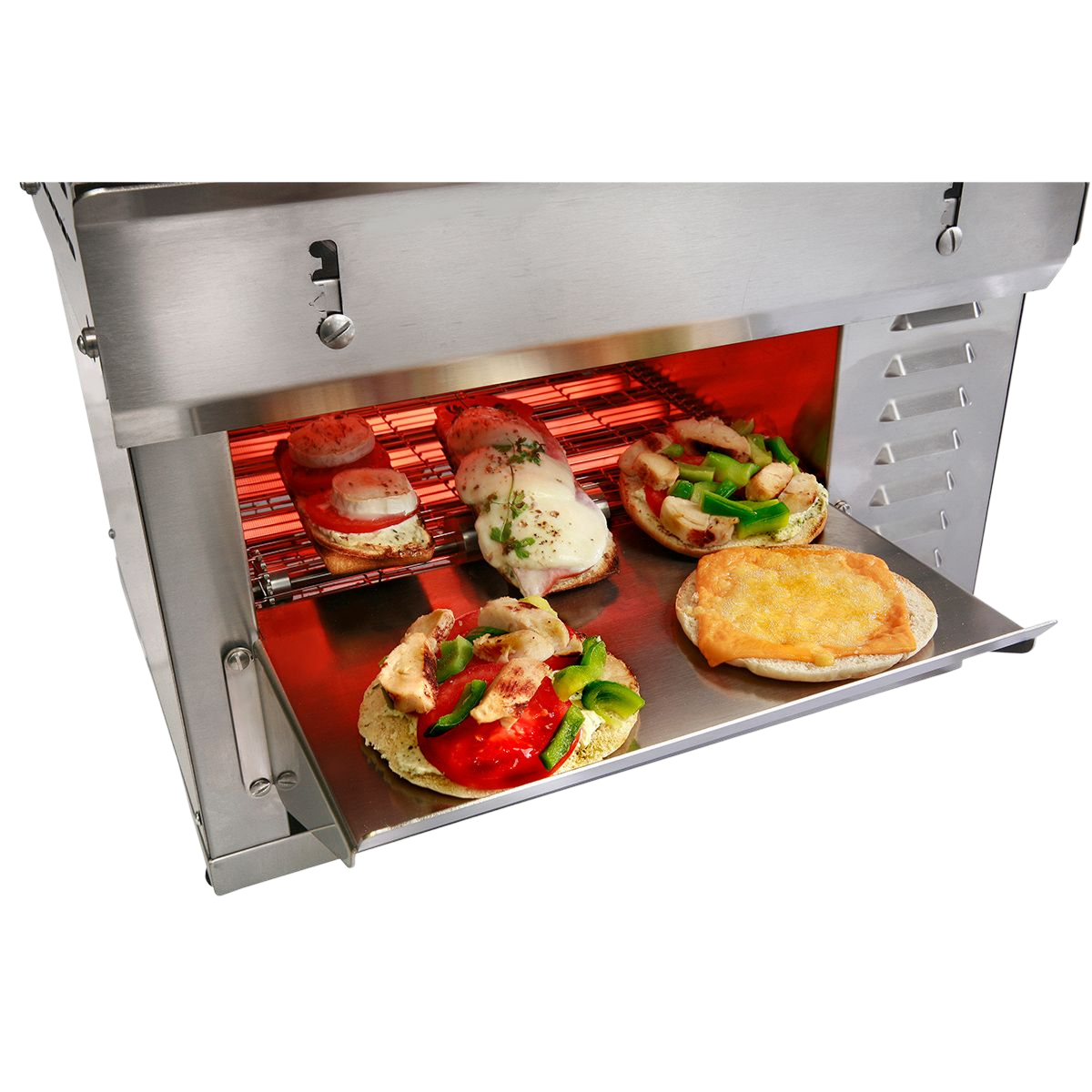 – The pass through height can be adjusted between 70 and 110 mm thanks to the stainless reflectors to concentrate the temperature in the cooking chamber and reduce the cooking time.