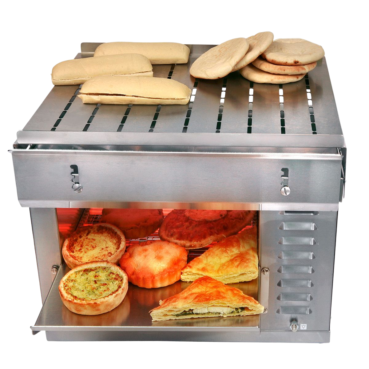 The top roof keeps warm breads or pastries.