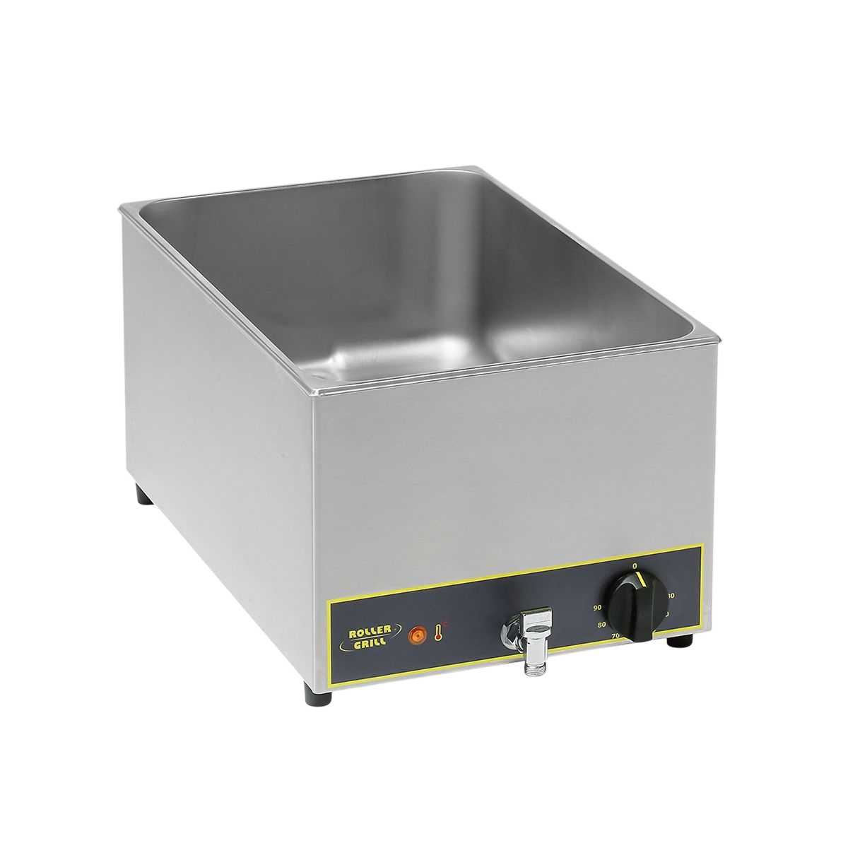 Equipement : puissance de chauffe, commutateur-thermostat de régulation, limiteur de température avec réarmement automatique, voyant de contrôle. Système de vidange inox sécurisé. Isolation renforcée. Livré sans bac GN.