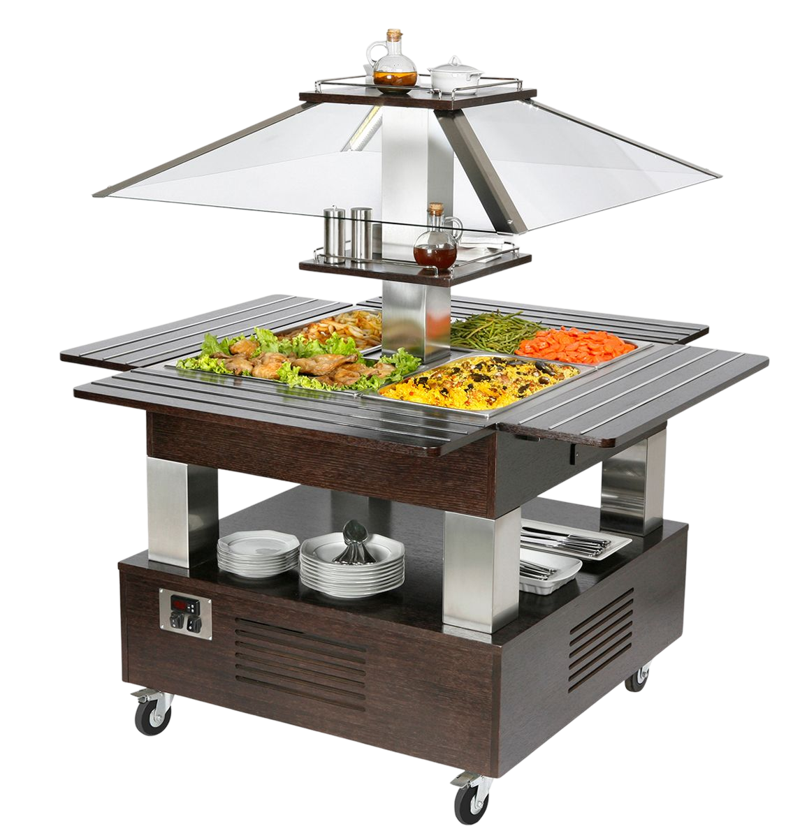 Equipement: buffet en bois avec miroir et à soubassement traversant pour le stockage d’assiettes. Poternes en inox brossé, toit et étagère centrale avec retenues amovibles, pare-haleine en verre, profilé alu sur tablettes de dressage rabattables, tablettes démontables pour le passage dans les portes standard 0,8 m, 4 doubles-roues dont 2 avec freins. Eclairage LED blanc-froid. 2 résistances blindées de chauffe. Bain-marie avec système de vidange. Accès direct pour un entretien aisé. Livré sans bac. Disponible en bois chêne clair, acajou, wengé ou blanc cérusé. Menuiserie française.