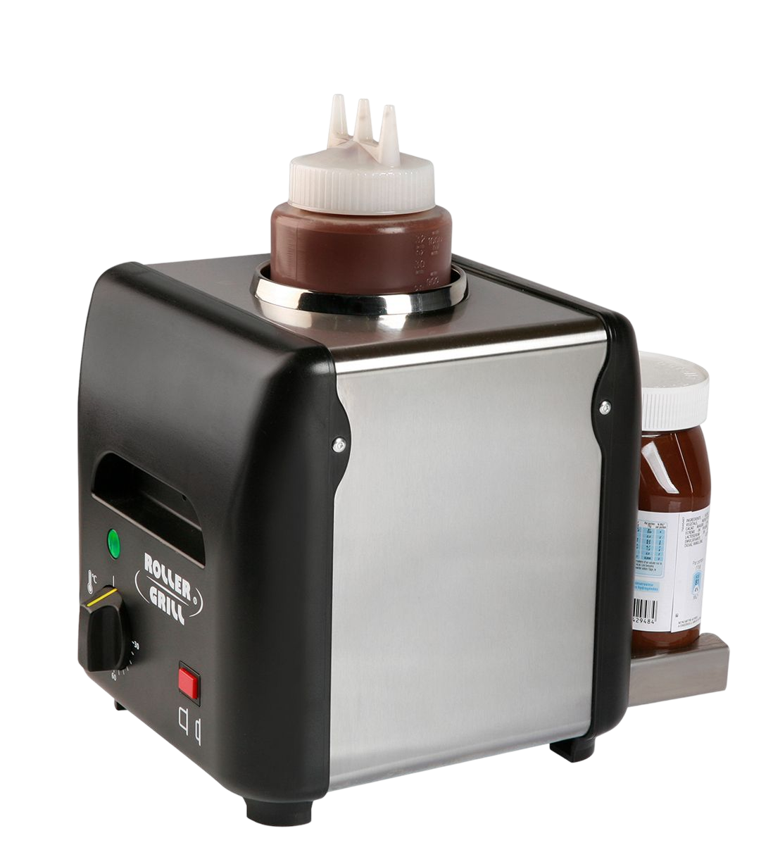 Equipement : thermostat commutateur pour une parfaite régulation de la température sans surchauffe ni desséchement. Résistance autour du bac inox. Présentoir retirable pour pot de confiture, miel, de pâte à tartiner ou flacon de coulis. Livré avec 2 bouteilles à pression munies de 3 sorties pour un dosage facile, précis et hygiénique.