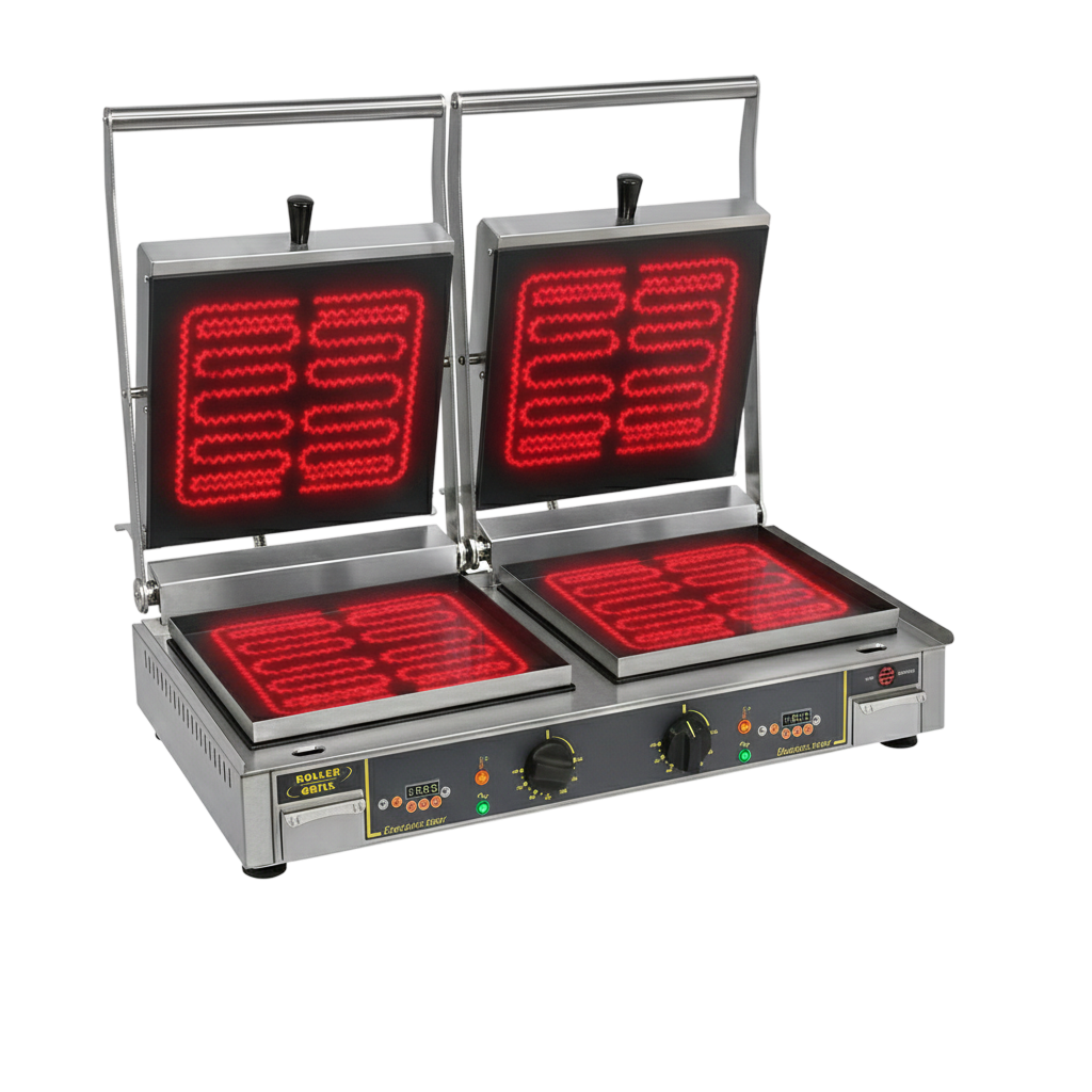 Le foyer vitrocéramique « Vitro-Speed-Grill ® » sous chaque plaque (verre > 500°C) permet une cuisson homogène par contact avec peu de puissance. Ce contact-grill vitrocéramique garantit une cuisson sans dégagement de fumée et il peut être utilisé sans extracteur.