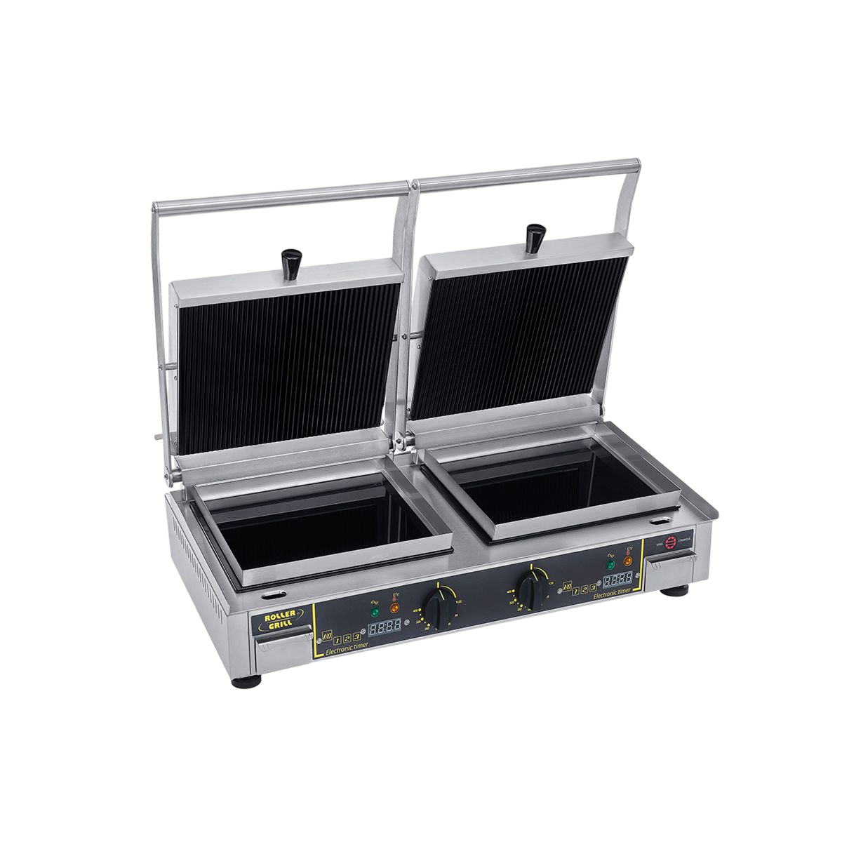 Equipement: thermostats 0-350°C, poignées inox, minuteries électroniques pour la programmation de 3 temps de cuisson indépendants, voyants de contrôle, tiroirs amovibles et lavables en machine. Disponibles avec des plaques vitrocéramiques lisses ou rainurées.