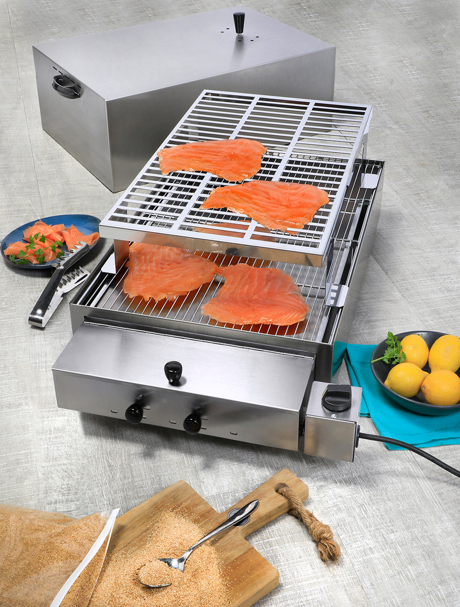 - La grille de cuisson supérieure permet de fumer sur les 2 niveaux des poissons, des crustacés ou de la charcuterie.