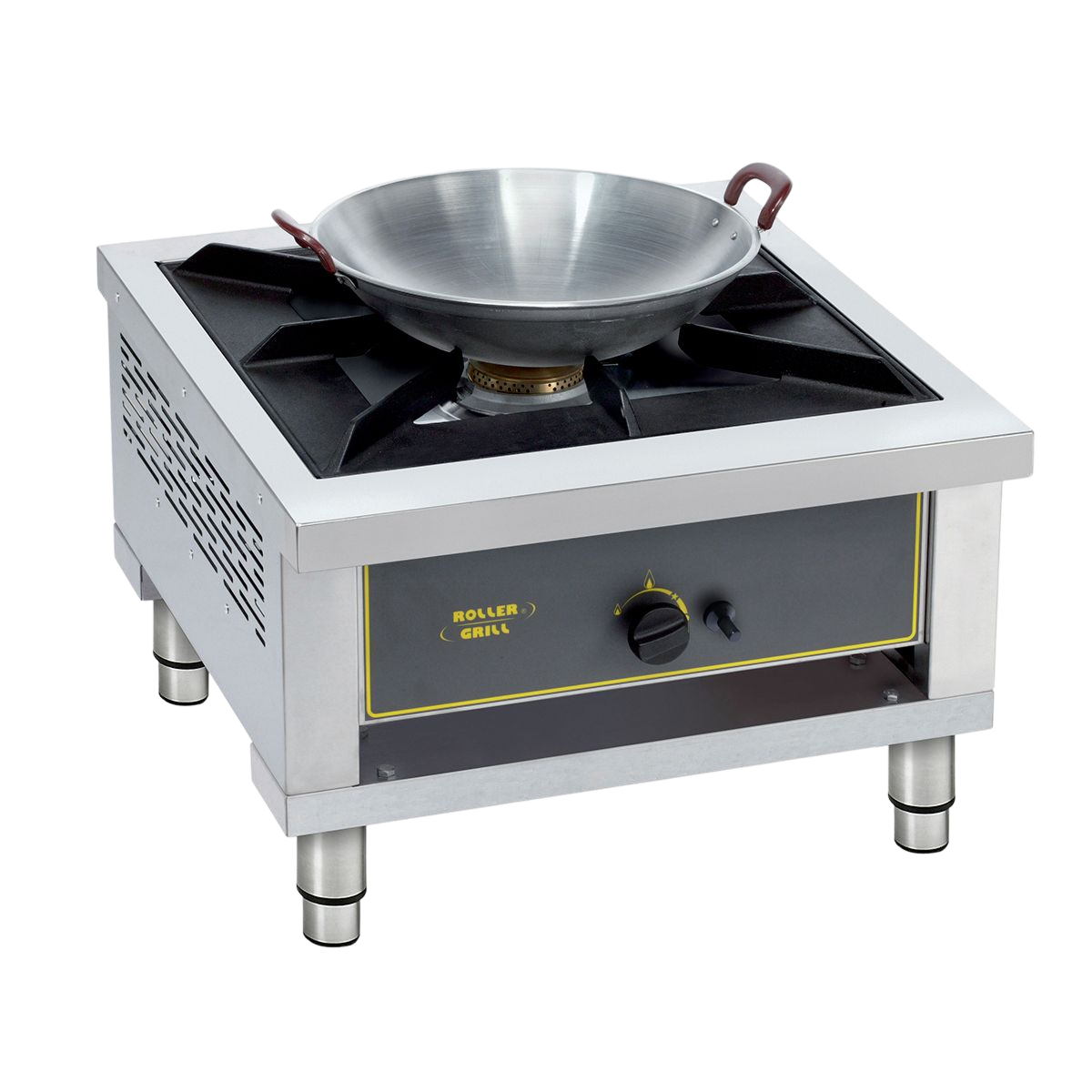 Equipement : brûleur de 12 cm de diamètre, allumage Piezo, bouton de réglage avec position de ralenti, grille réversible en fonte, thermocouple de sécurité. Livré en butane/propane avec pochette d’injecteurs pour gaz naturel (160 mm de diamètre ). Pieds modulables de hauteur 100 mm ( CE / UL-NSF ). Livré sans wok.