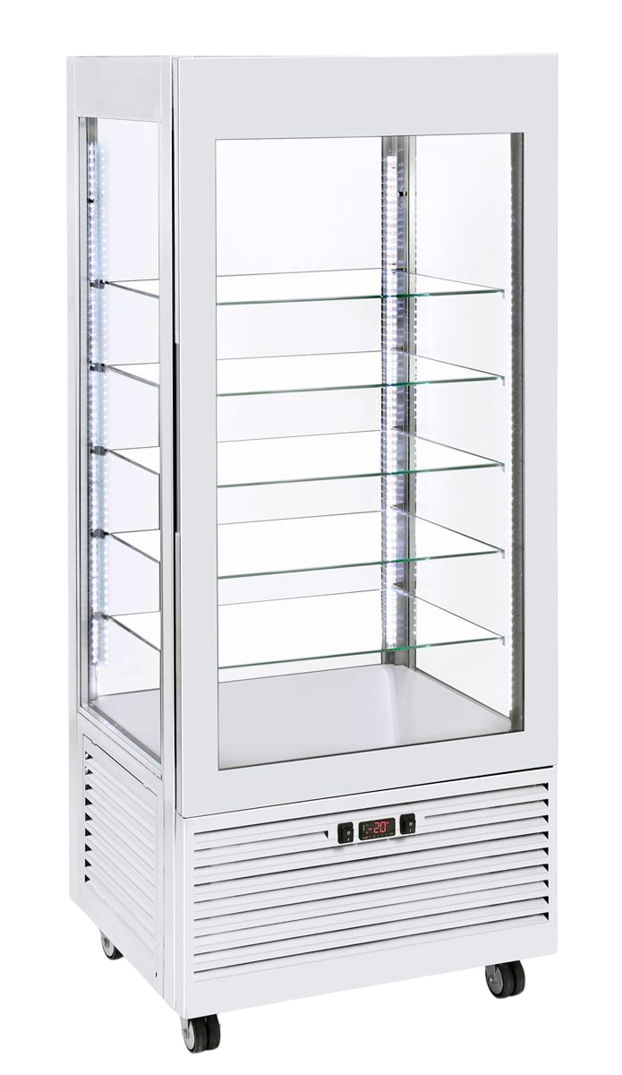 Vos pâtisseries et créations culinaires glacées sont présentées sur 5 étagères en verre de dimensions 610 x 510 mm et réglables sur 6 niveaux.