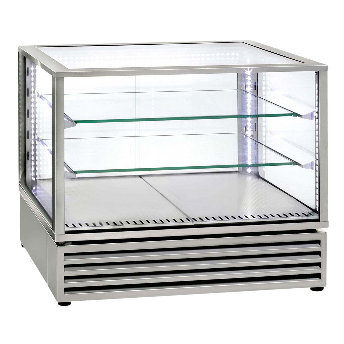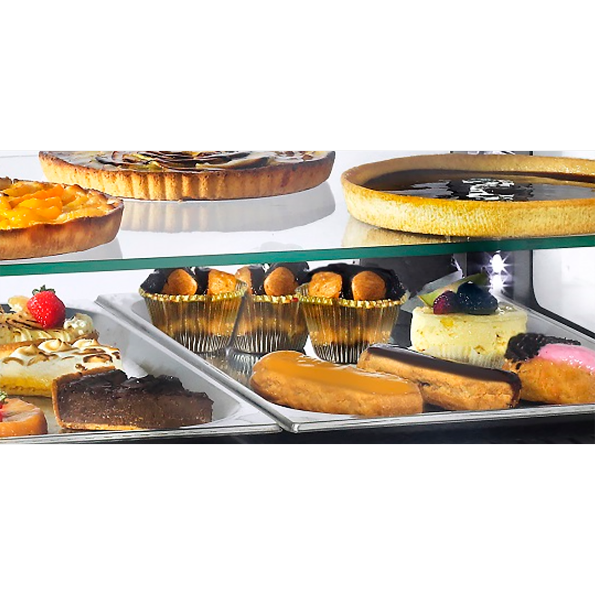 Vos pâtisseries et créations culinaires sont présentées sur 2 étagères en verre de dimensions 645 x 490 mm et sur un plateau inox pouvant accueillir 2 plats GN 1/1.
